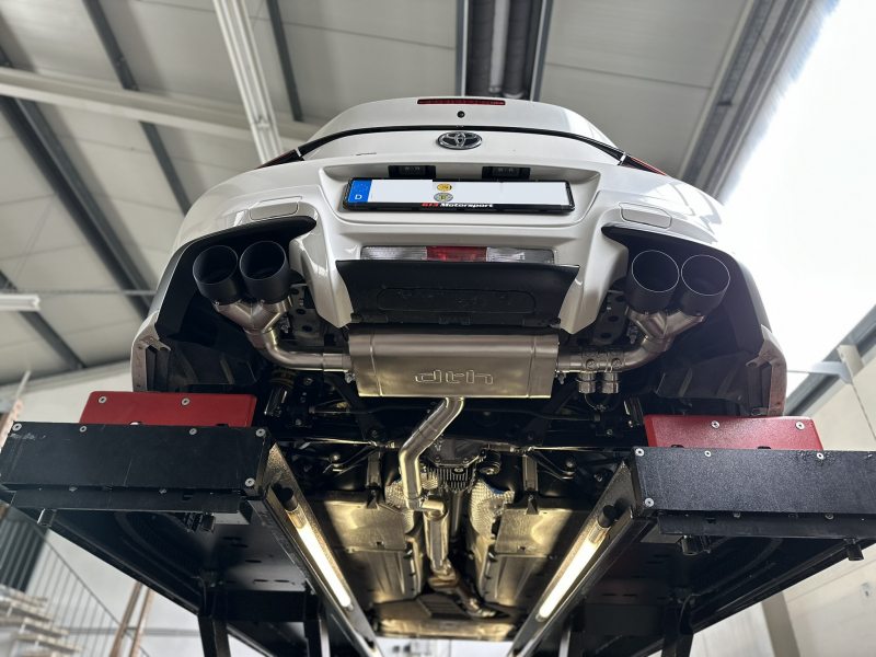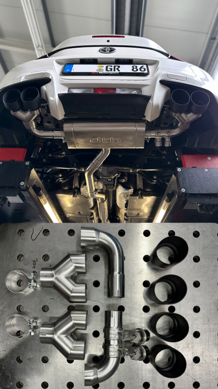DTH baut die erste legale Klappenabgasanlage für die JDM Klassiker GR86 , jetzt auch als TRD Umbau. Den GR86 gibt es als Sondermodell TRD , mit mächtigem Breitbaukit das sich ab Werk in die Linie des GR einschmiegt, perfekte Passgenauigkeit , extravagante Optik all das macht den GR86 TRD zum absoluten Klassiker der JDM Szene. Leidergibt es, nein gab keine passende Abgasanlage für den Umbau, also haben wir unsere Klappenanlage einmal komplett angepasst.Dabei wurden die Endrohrbögen geändert um jeweils 2 ( 4 insgesamt ) 101mm Endrohre aufzunehmen. Die Endrohre könnt ihr schwarz oder auf NACHFRAGE in Wunschfarbe ceramicbeschichtet erhalten.