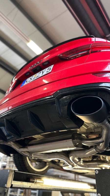 System: Wir entwickeln unsere Abgasanlagen auf unserem hauseigenen Allrad-Leistungsprüfstand, als Teil eines Performance Paketes. Die Anlagen können in der Regel durch eine Downpipe mit höherem Durchsatz / Thermo-Isolierung und ein geändertes Intake zum Performance Paket ergänzt werden. Abgerundet wird dies durch eine anpasste Programmierung / Abstimmung auf dem Prüfstand. Die Downpipes / Abgasanlagen entwickeln wir nicht als einzelne Bauteile sondern so, dass die gesetzlichen Vorgaben auch im Verbund mit Downpipe / Intake / Leistungssteigerung eingehalten werden und somit eine Eintragung aller Bauteile im Verbund möglich ist. Dafür werden die Systeme ausgiebig auf dem Prüfstand getestet und dem TÜV und im Abgaslabor getestet.
